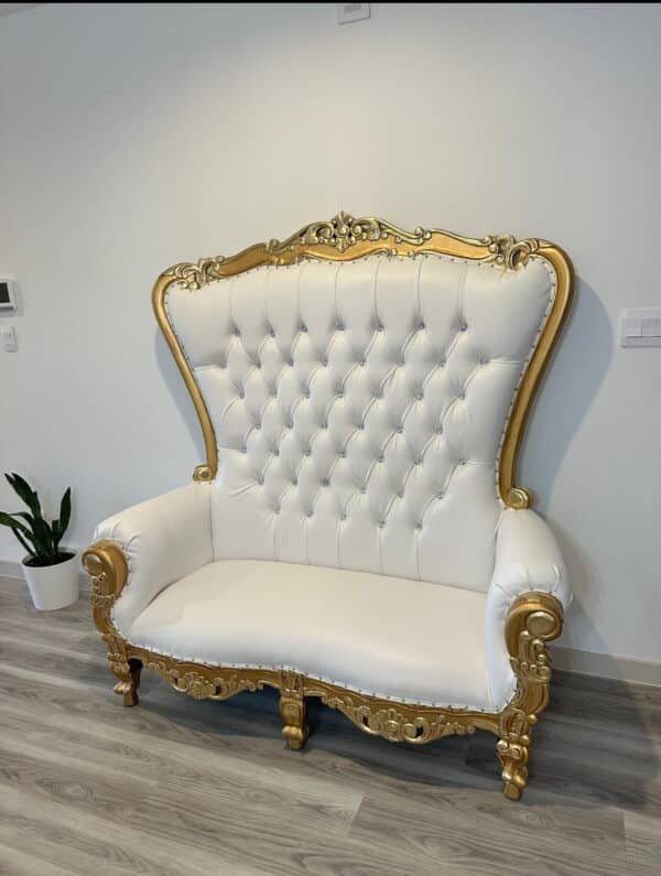 Make your guests of honor feel like royalty with our Double Throne Chair rental in Katy, Fulshear, and the greater Houston area. This stunning pair of king and queen throne chairs is the ultimate statement piece for events where two people share the spotlight — quinceañeras with the birthday girl and her chambelán, weddings with the bride and groom, or anniversaries celebrating the couple.