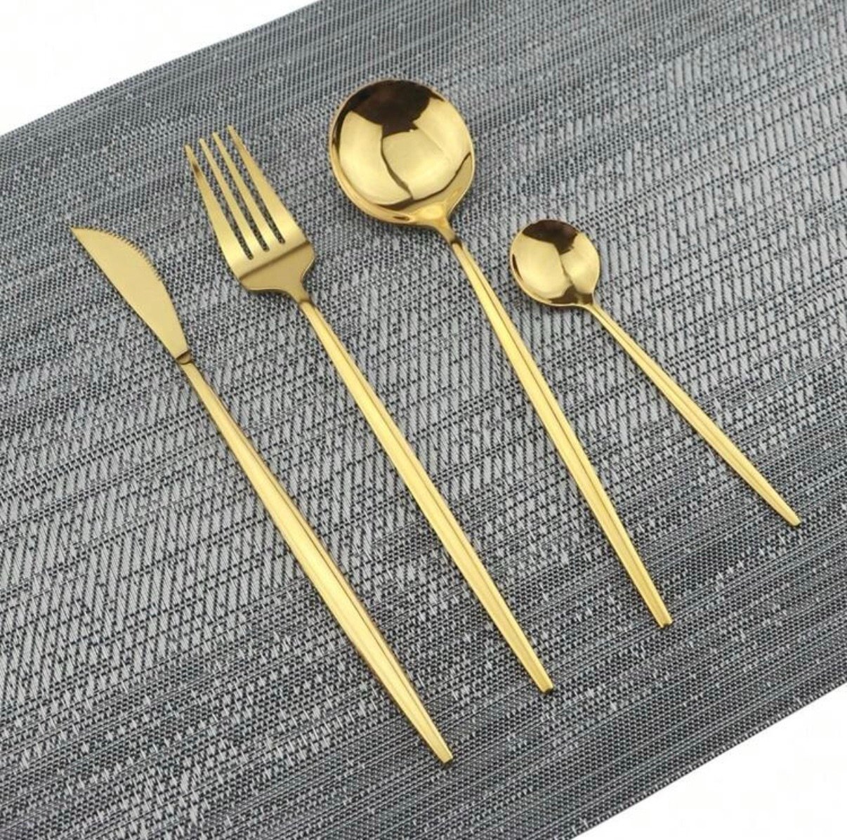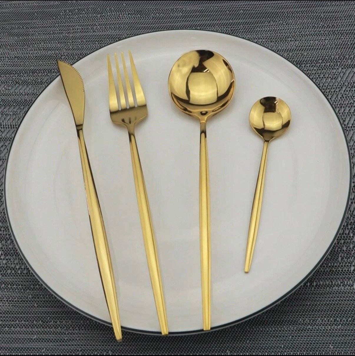 Make every meal feel special with this sophisticated gold flatware set. Featuring a modern design, clean lines, and a matte finish, it brings a luxurious touch to any table setting. Crafted from high-quality materials, each piece is durable, comfortable to use, and perfect for both everyday dining and special occasions.