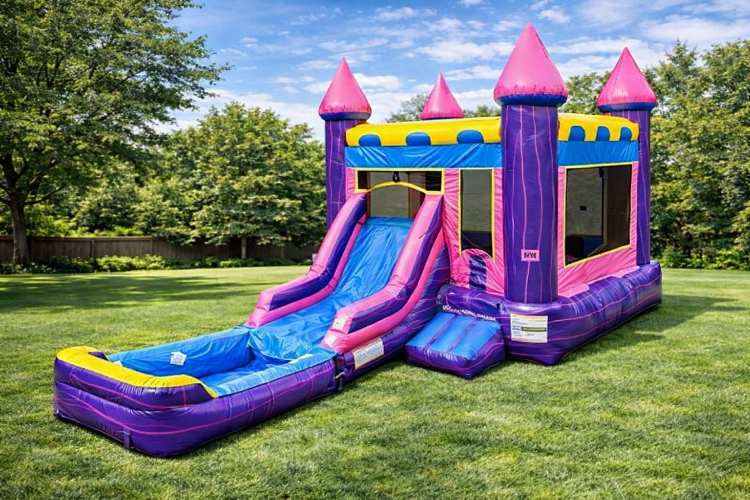 This combo unit features a bounce area AND a water slide in one compact package, giving kids the best of both worlds without needing a huge yard. It’s one of our most popular summer rentals.